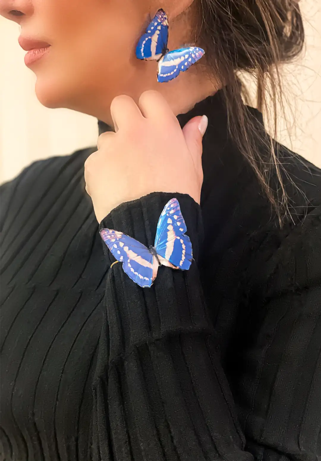 نیم ست پروانه آبی آوان | دستبند کشویی و گوشواره استیل با پروانه رزینی