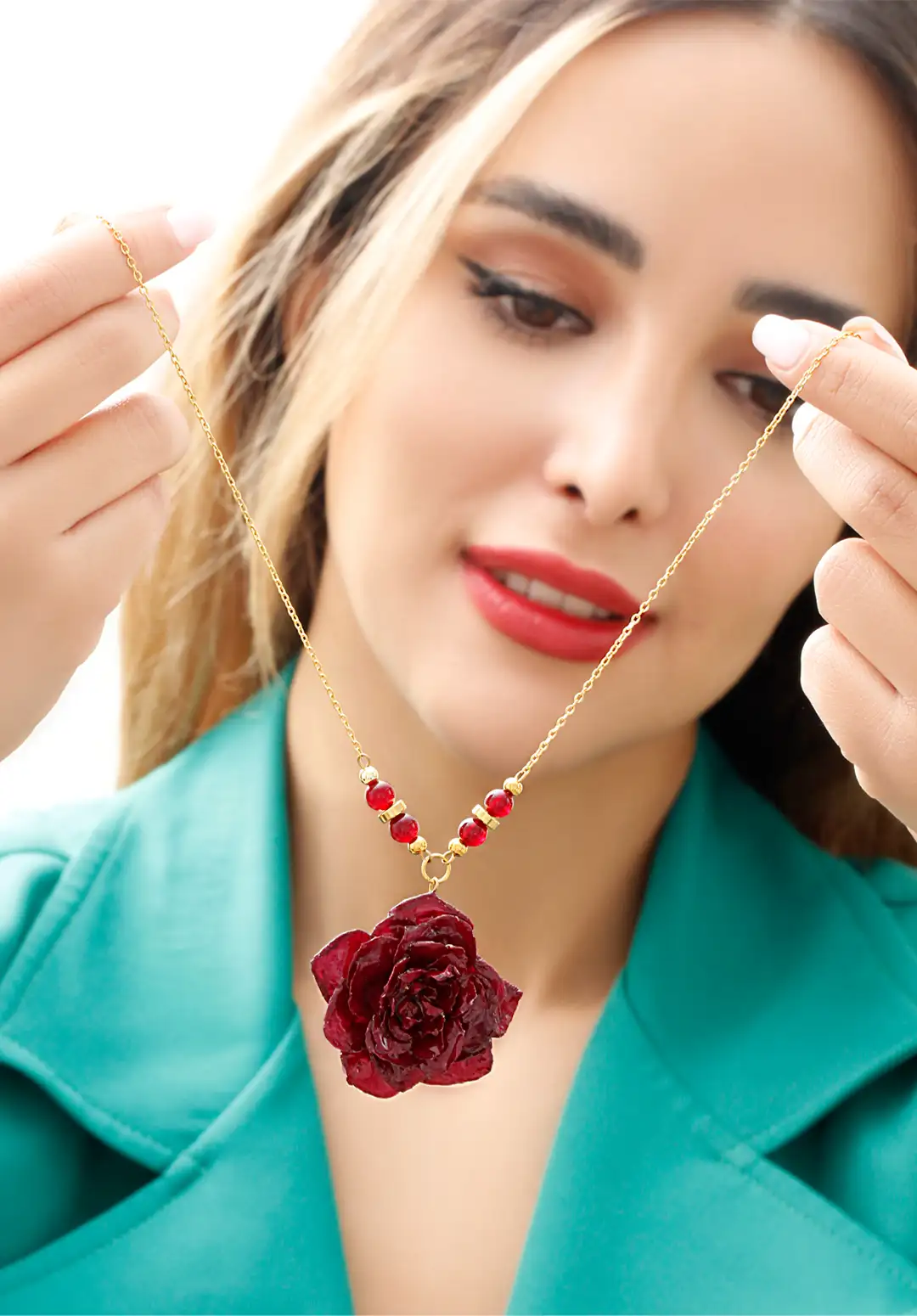 آویز گل رز سرخ گردنبند بهدیس همراه با مهرههای عقیق سرخ