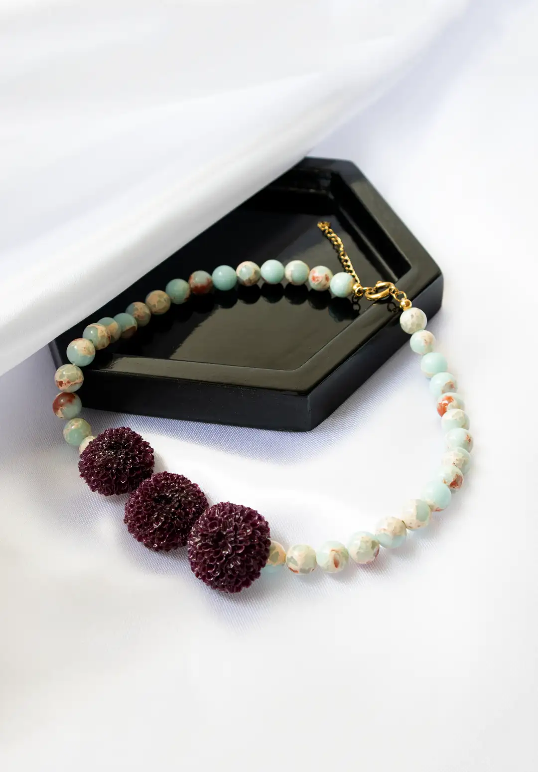در کنار این گلها، سنگهای جاسپر امپریال آبی قرار گرفتهاند. این سنگها با رگههای طبیعی و رنگ منحصربهفردشان، جلوهای هنری به گردنبند دادهاند.