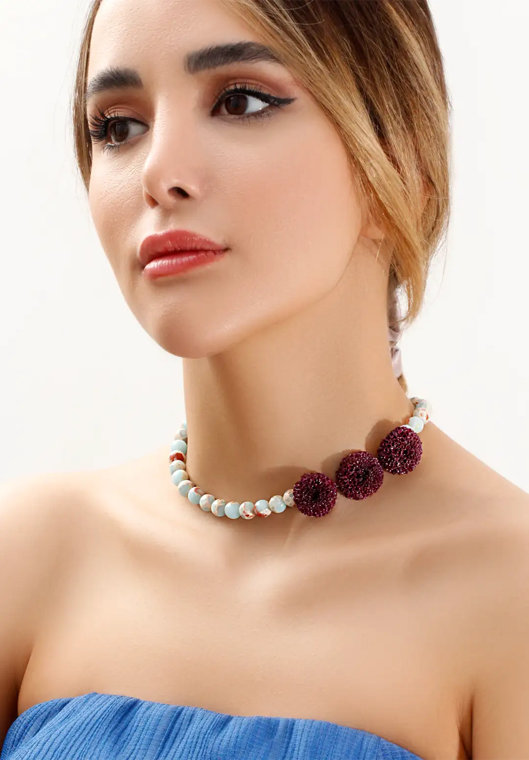 نمای نزدیک از مهرههای سنگ جاسپر امپریال آبی در گردنبند زنانه گل میس