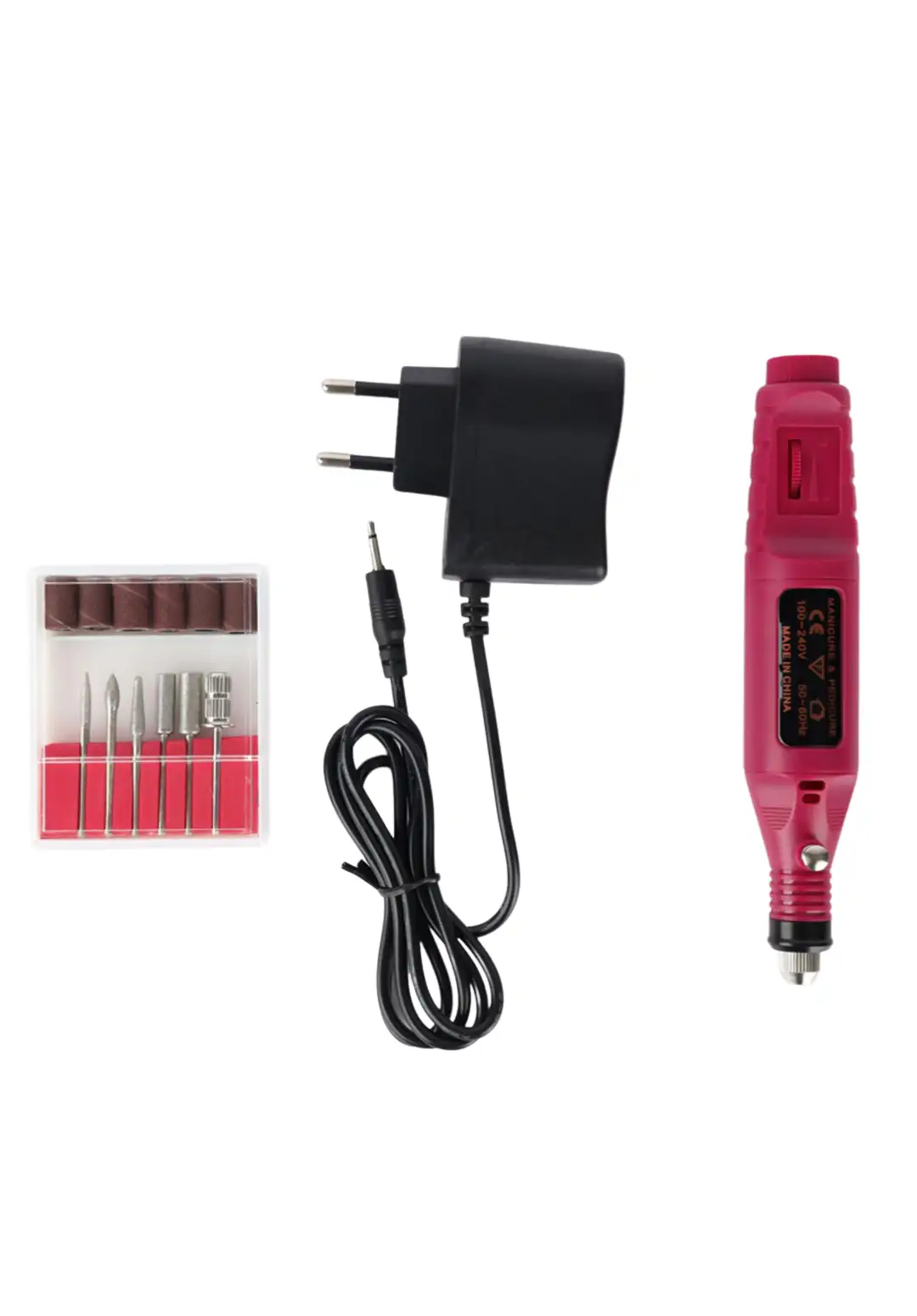 مینی سوهان برقی صورتی با آداپتور برق، سریها و متههای متنوع مناسب پرداخت رزین، و کابل برق مناسب ایران