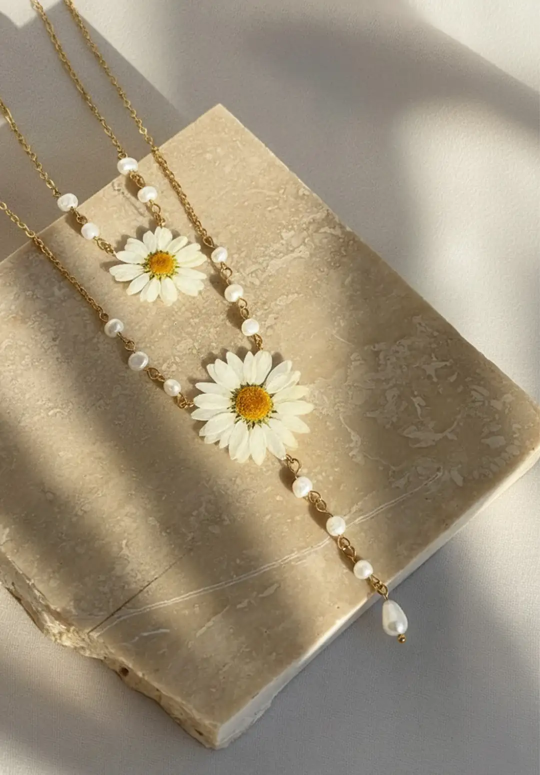 خط اول با مرواریدهای پرورشی و گلهای بابونه آغاز میشود و در انتها به آویزی لطیف میرسد که مثل لبخندی سفید بر گردنت میدرخشد.