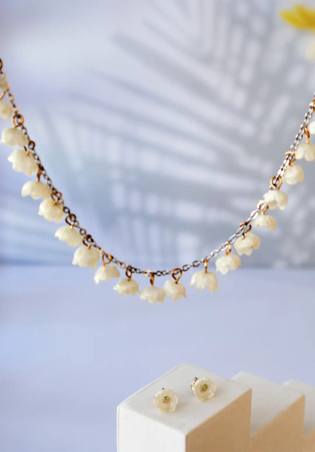 نیمست گل موگه دستساز طنان شامل گردنبند و گوشواره با گلهای طبیعی کاور شده با رزین UV و زنجیر استیل ضد حساسیت، طراحی لطیف و مینیمال