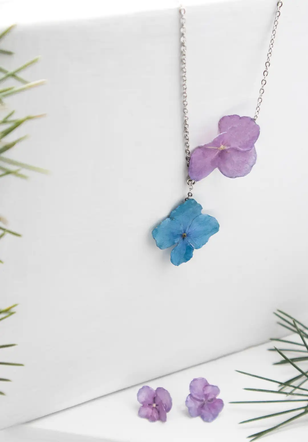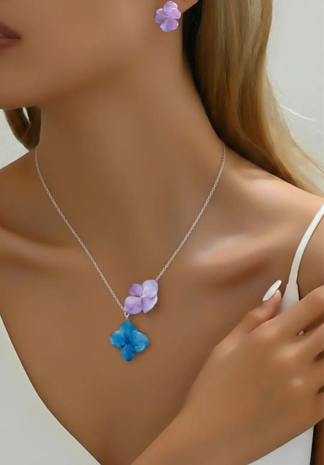 کلوزآپ گوشوارههای نیم ست گل طبیعی رزینی طنین با گلهای هورتانسیا یاسی