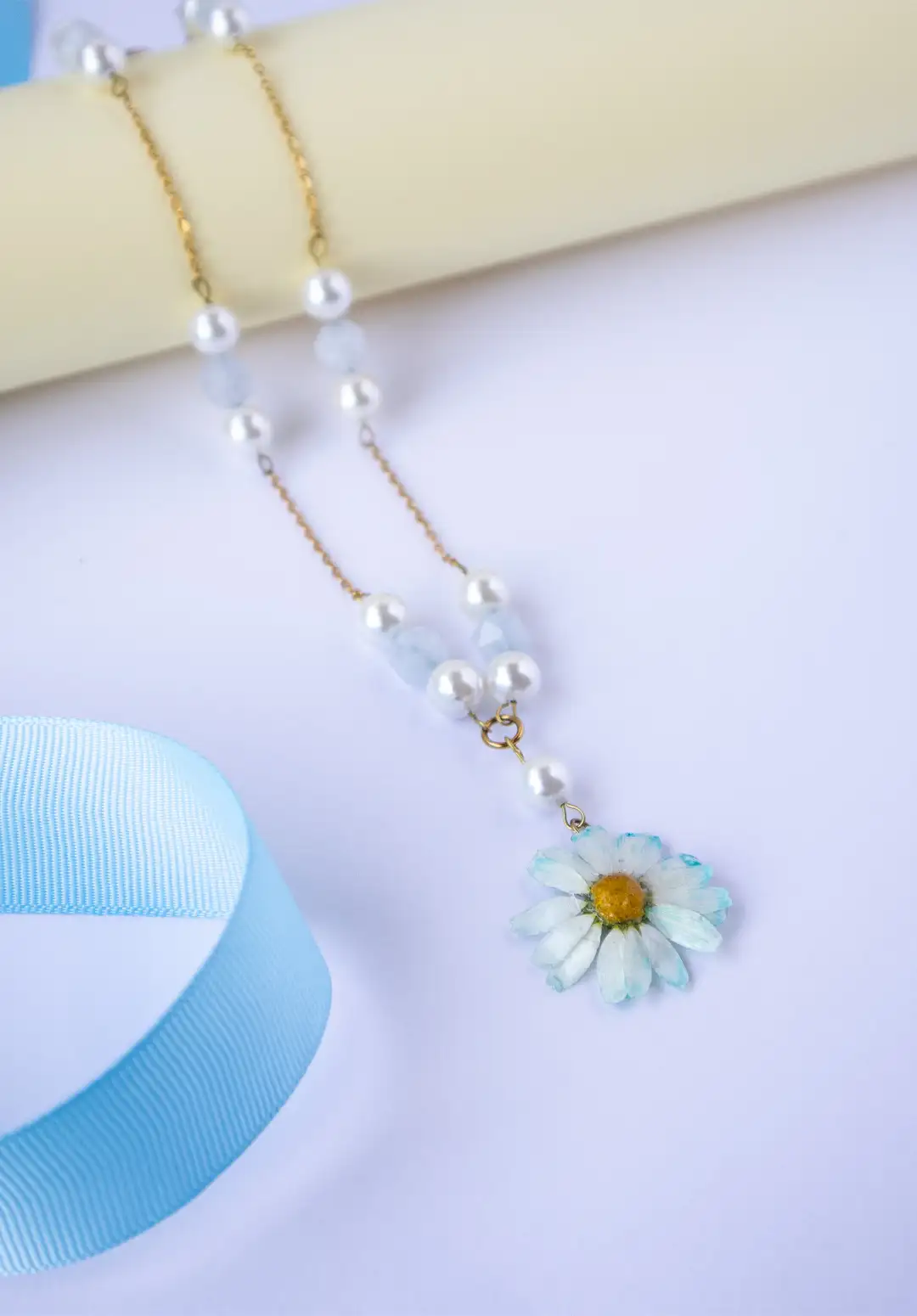 ما در ساخت این زیور، گل بابونه طبیعی رنگشده به آبی و سفید را با سنگهای آکوامارین و صدفهای سفید ترکیب کردیم. سپس با زنجیر و اتصالات استیل ضدزنگ، تمام اجزا را به شکلی هماهنگ در کنار هم نشاندیم.